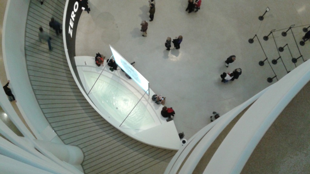 Et toi qu’est-ce que tu vas faire ? Aller acheter une carte postale et un stylo à la boutique, deux étages plus haut, et lui écrire qu’elle est belle en lui laissant ton adresse courriel (car tu n’as pas de numéro de téléphone aux EUA) ? Pourquoi faire, tu pars de New York demain… Et pourquoi pas ? N’as-tu pas une œuvre à réaliser ici, toi qui n’a pas eu le courage d’en réaliser une autre, juste avant, en te jetant dans le bassin du musée, au rez-de-chaussée ?